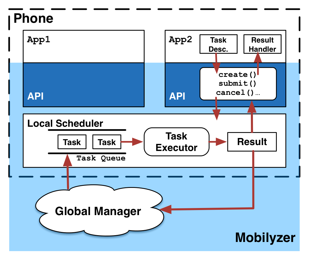 Mobilyzer consists of an app library, a local measurement scheduler, and a cloud-based global manager: Measurement Library. Mobilyzer is designed to be easy to use and integrate into existing apps, while providing incentives for doing so. It is deployed to apps as a library with a well-defined API for issuing/controlling measurements and gathering results locally. This facilitates development of new apps that use network measurements. For example, an app that includes our library can issue a measurement and retrieve results with under 10 lines of code. Existing apps can incorporate our library to take advantage of our validated measurement tools and server-side infrastructure. |